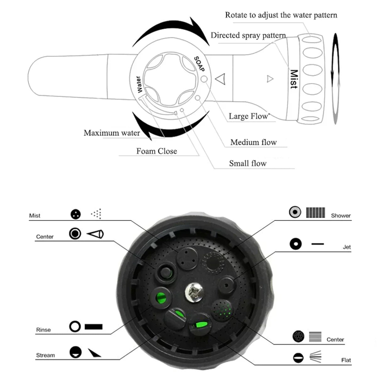 The car wash hose nozzle has 8 spray patterns and a built-in soap dispenser. New design technology concentrates water pressure to one point, with a spray distance of 6-10 meters! 🌊🔹 Built-in Soap Dispenser: